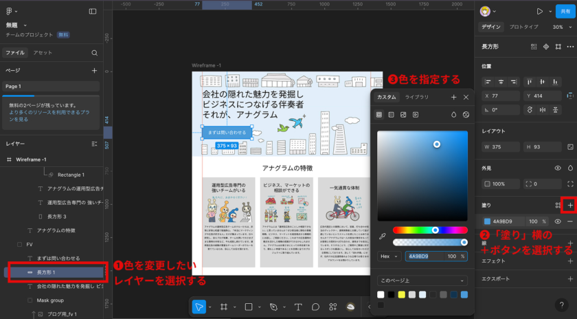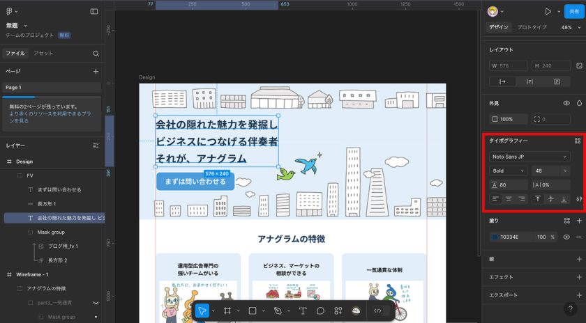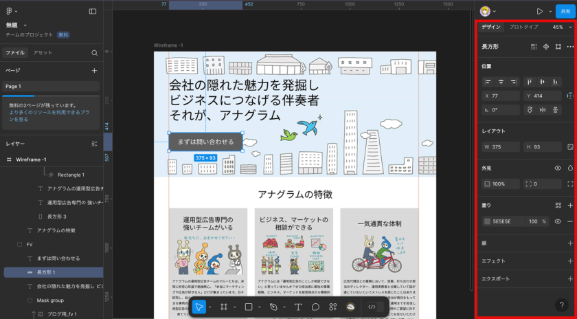 また、FigmaはUIデザインに特化したツールなので、ボタンやフォームといったLPでよく使う要素も直感的に作成できます。