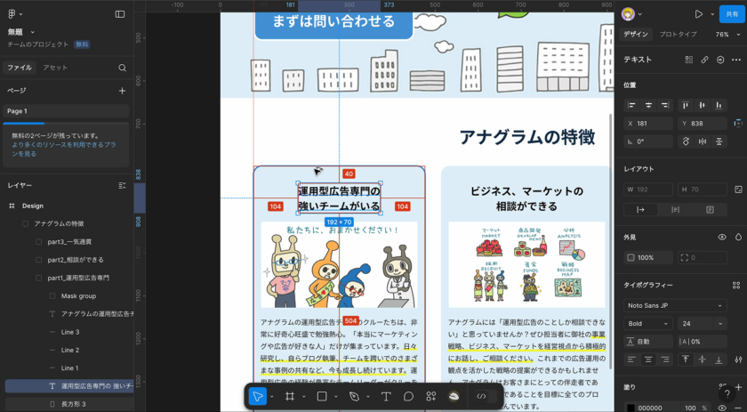 「構成ってどうやって作ればいいの?」「ツールは何を使えばいい?」と迷いがちなLP制作も、Figmaひとつあれば、構成づくりからデザイン・フィードバックまでスムーズに進められます。この記事を読んで興味をもっていただけた方は、ぜひチャレンジしてみてくださいね。