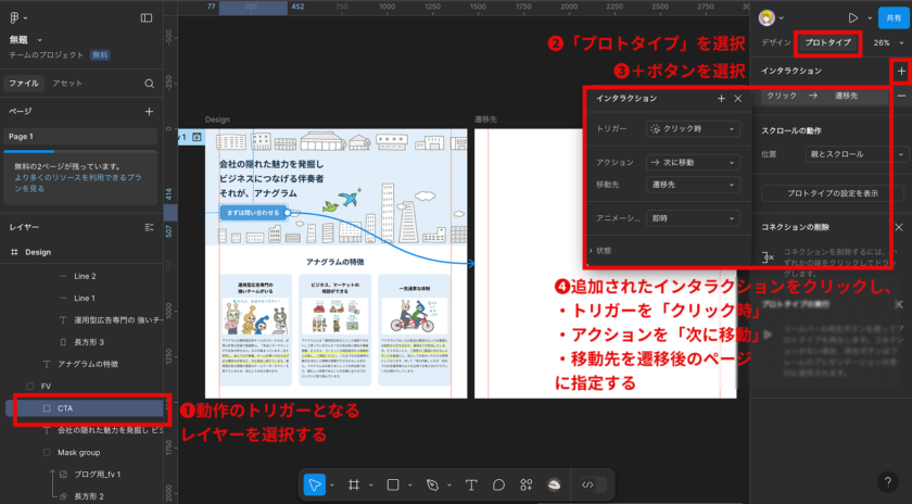 プロトタイプで、CTAのページ遷移を見たい場合は以下のように設定します。