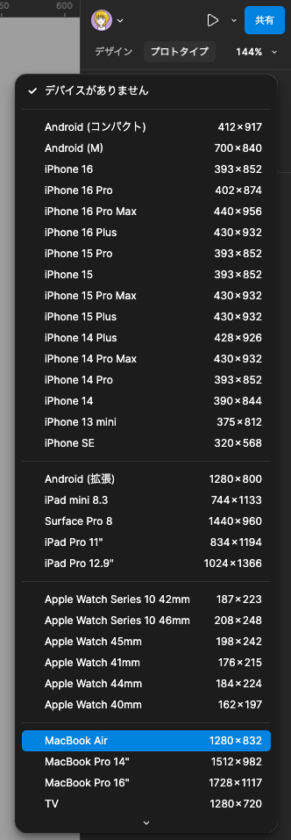 実機に近い状態で確認するため、何も選択していない状態で、右サイドバーのプロトタイプ設定から「デバイスがありません」ボタンを選択します。その中で、確認したいデバイスを選択しましょう。