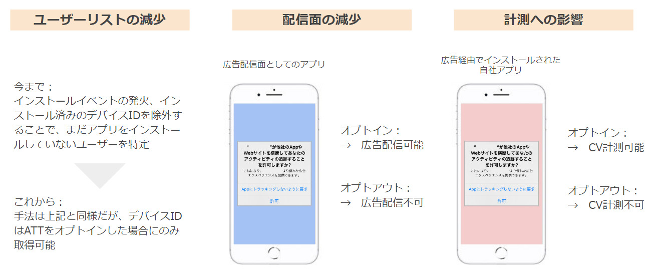 しかしながら、アプリをインストールしていてもATTでオプトアウトしているユーザーのIDFAは取得できず、インストール済みユーザーのリスト数が減少します。