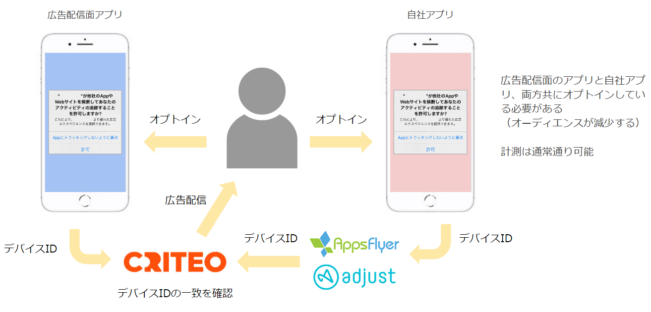 インストール広告を通じてインストールしたアプリを初めて起動した際は、ATTのパーミッション画面がポップアップ表示されます。そこでオプトインするとIDFAをCriteo側でも取得できるのですが、オプトアウトした場合はIDFAを取得できません。