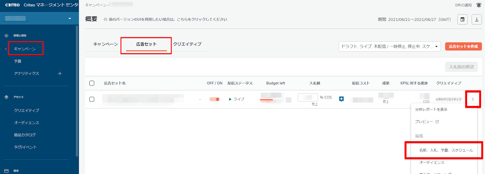 - 管理画面の「キャンペーン」→「広告セット」→変更したいキャンペーンの右端にある3点リーダーをクリック