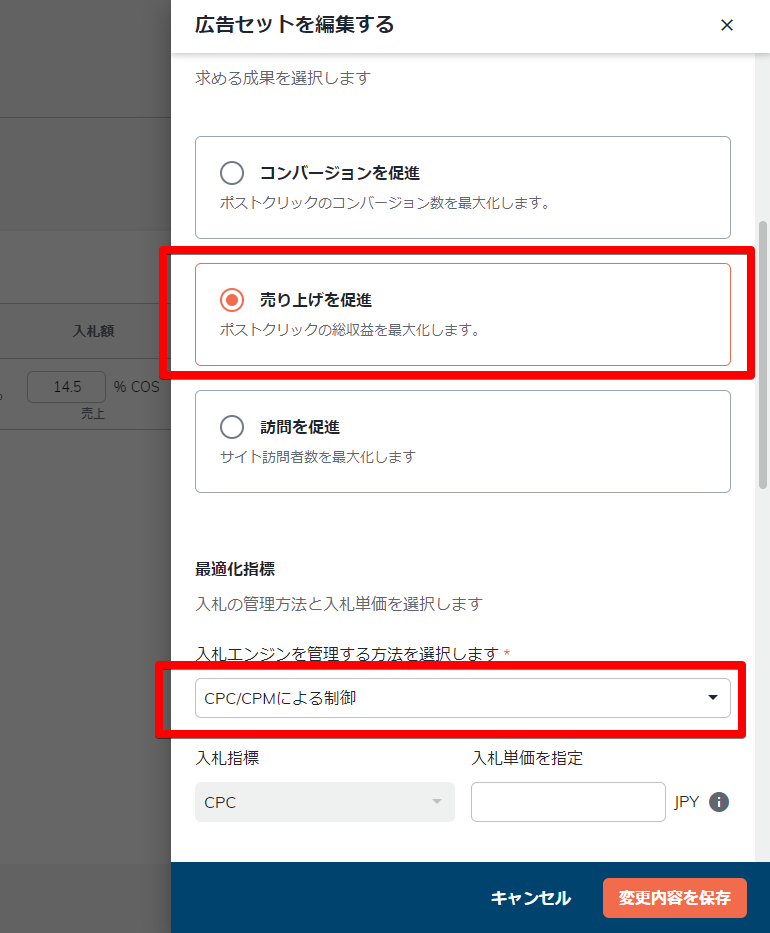基本的な操作はROエンジン変更時のものと同じです。「エンジン」は「売上の促進」のままで、「最適化指標」の「入札エンジンを管理する方法を選択」で選択する項目が異なります。