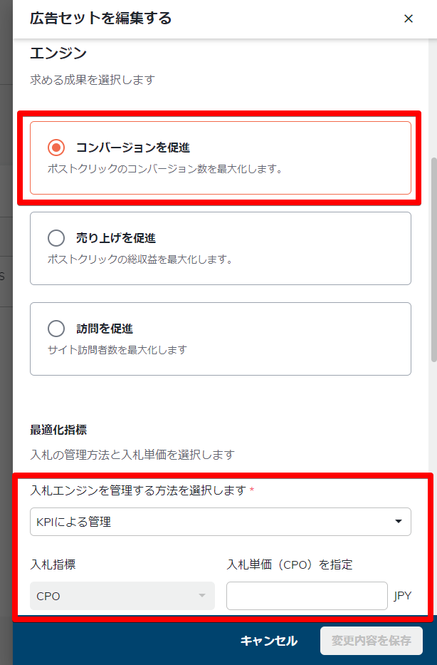 基本的な操作はこれまでと同様です。「エンジン」は「コンバージョンを促進」を選択し、「最適化指標」は「KPIによる管理」で、目標のCPOを入力、「変更内容を保存」で完了です。