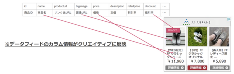 Criteoを含め一般的なダイナミック広告では、データフィードの情報が自動的にクリエイティブに反映されます。