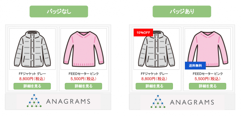 バッジ機能は、データフィードに登録されている情報から、どのような条件の商品にどのバッジをつけるといった出し分けが可能です。