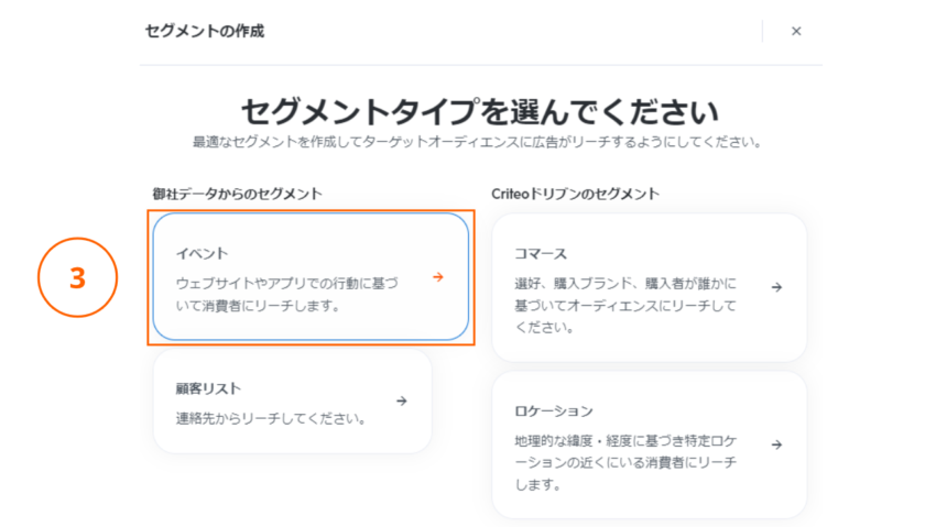 まず、Criteo管理画面にログインし、「イベントセグメント」が設定できる画面に遷移します。