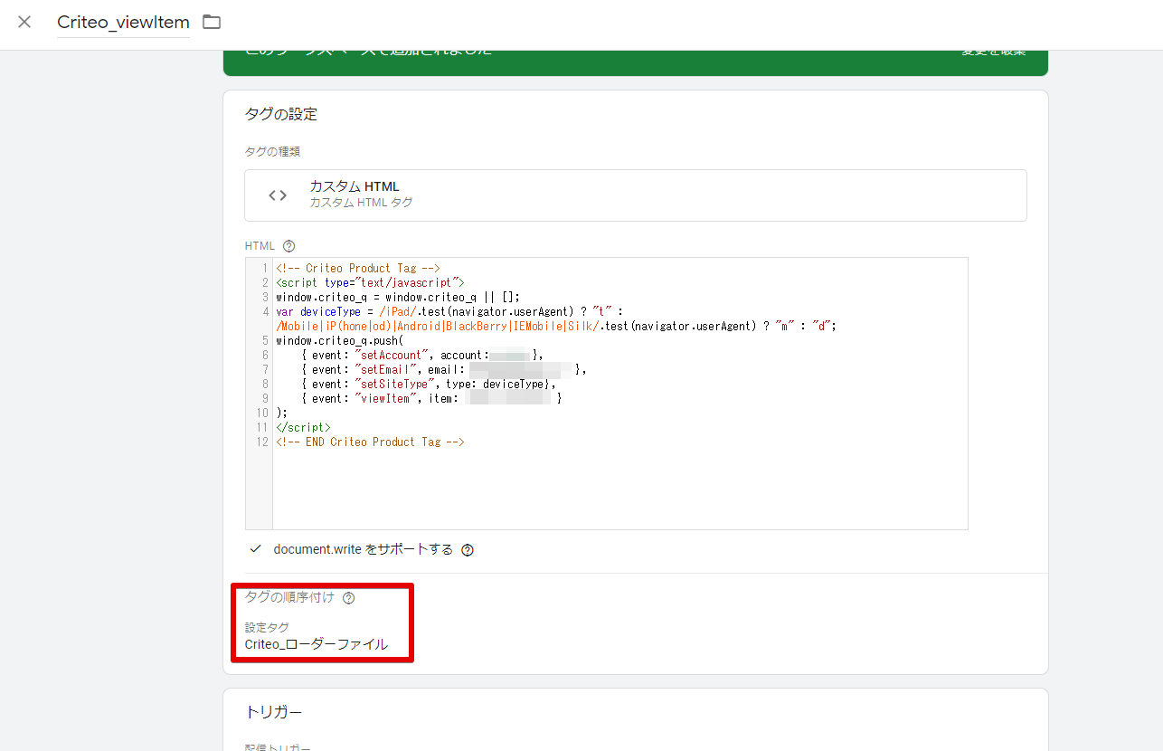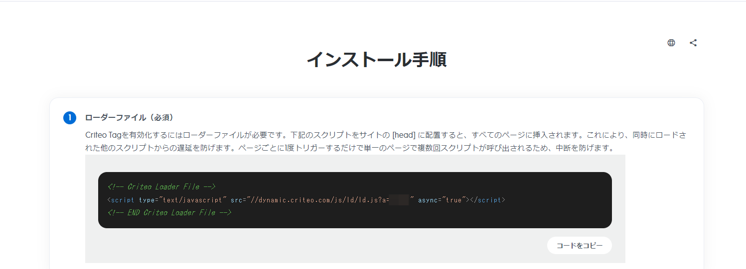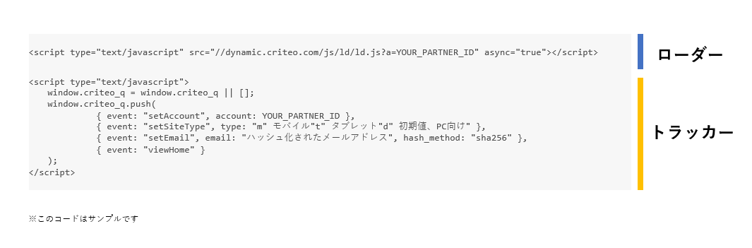 ローダーファイルはトラッカーで取得した情報をCriteoのサーバへ送信する役割を担っているため、トラッカーよりも先にローダーファイルが読み込まれている必要があります。