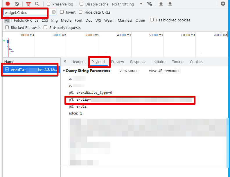 3. 「Network」の絞り込み条件に「widget.Criteo」と入力します