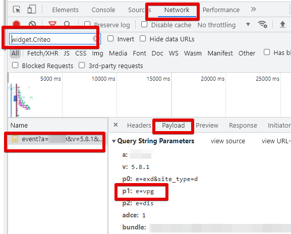 3. 「Network」の絞り込み条件に「widget.criteo」と入力します