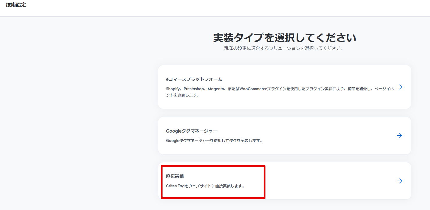 Criteoタグの最新のコードは、広告管理画面の「タグ/イベント」>「タグを再設定する」>「直接実装」>「インストール手順」から確認できます。