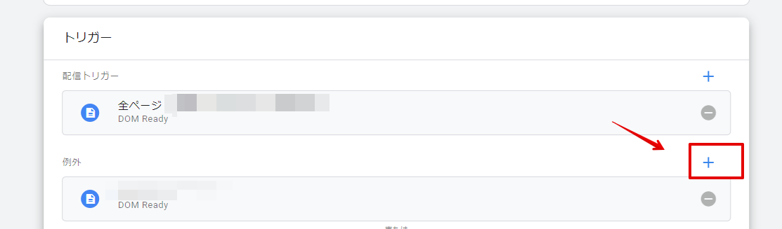 viewPageタグを選択し、下部の「トリガー」の右上のエンピツマークをクリックします。次に「例外」欄右にある+マークをクリックします。