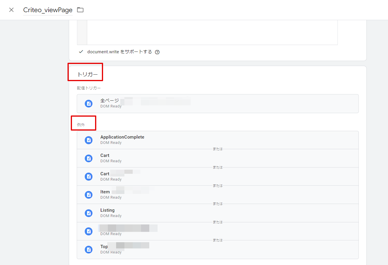 訪問タグ(viewPage)は、他のイベント(Home~CV)を実行しない場合に実行させるイベントです。そのため、トリガー設定でHome~CVイベント用のトリガーを除外しておきましょう。