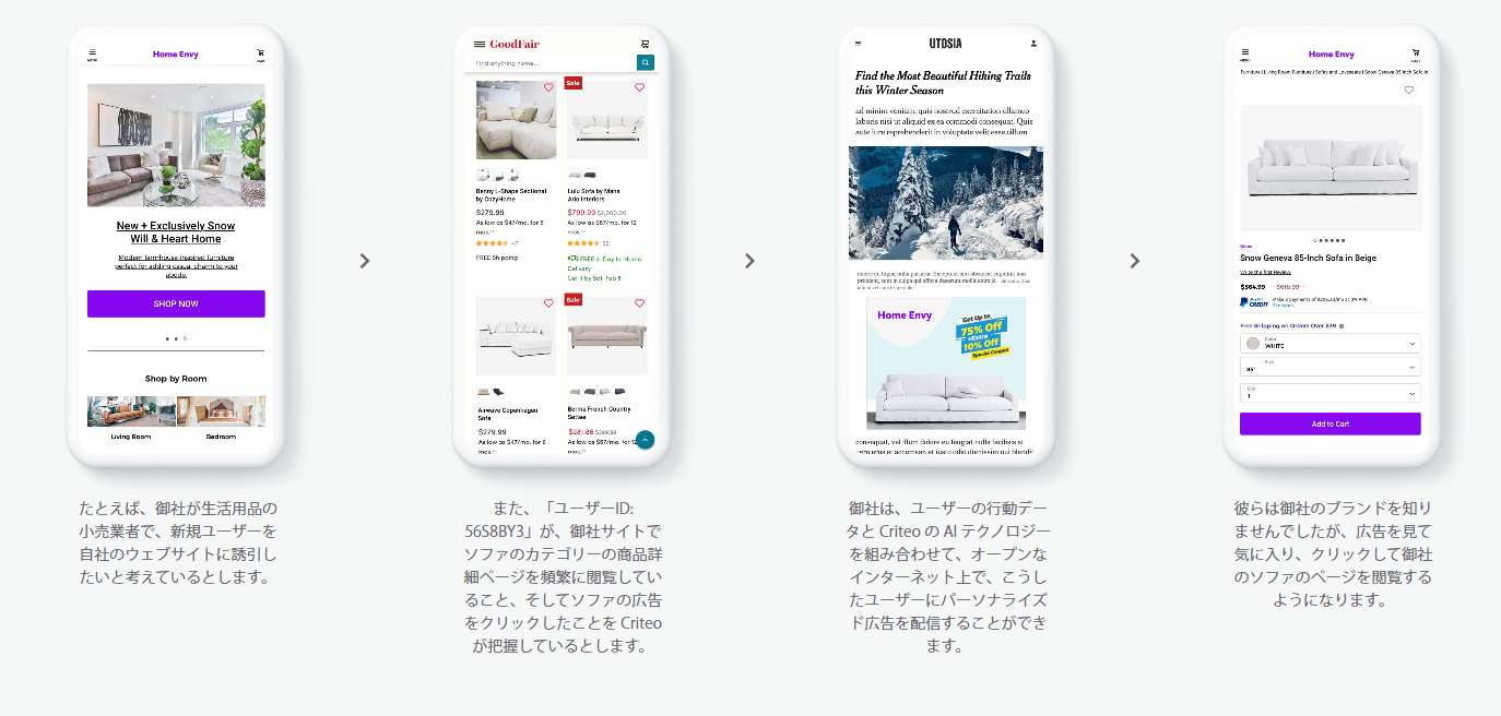 実際にどのように新規ユーザーの流入につながるのか、Criteo トラフィックジェネレーション配信の仕組みを説明します。