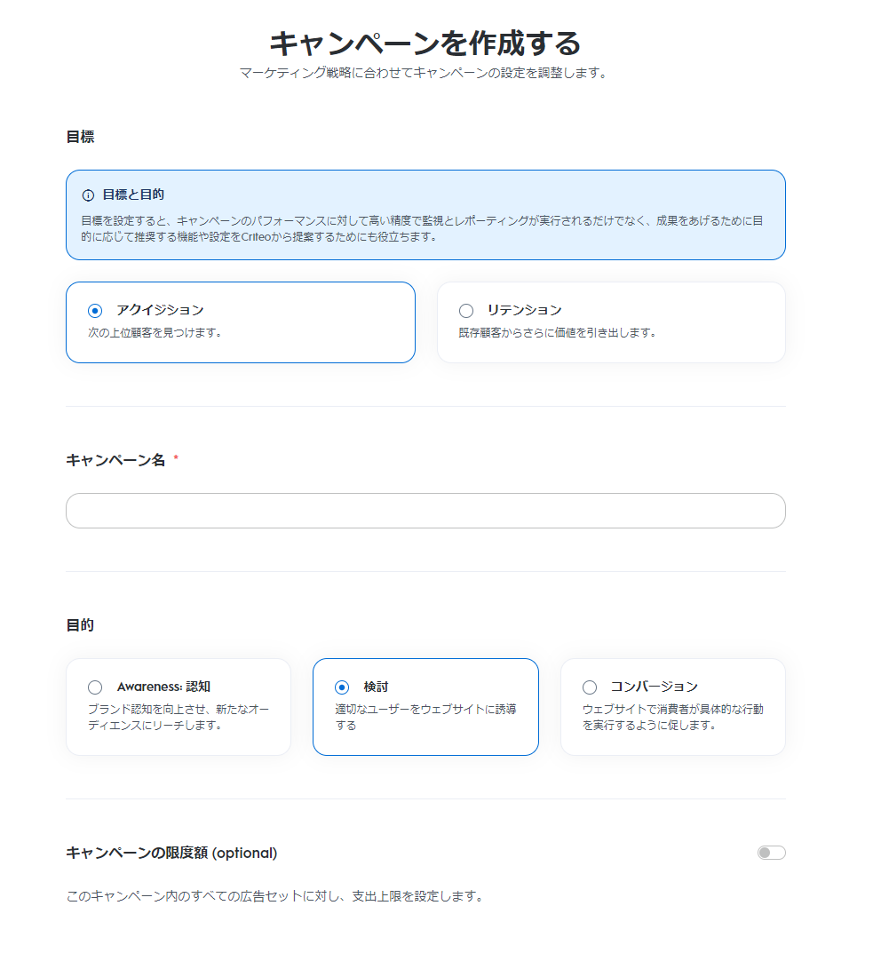 - キャンペーン目標:アクイジション(次の上位顧客を見つけます)