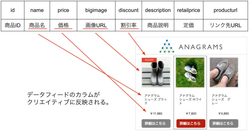 つまりデータフィードは、「どのユーザーにどの商品を見せるか」という配信過程にも、そして「実際にユーザーが目にする広告クリエイティブそのもの」にも関わっているのです。