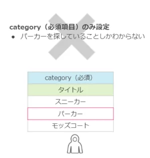 必須項目のcategoryだけでは、パーカーに興味があることしか学習できません。これでは、女性用のパーカーを探しているユーザーや白などの他のカラーを探しているユーザーにまで広告が表示されてしまう可能性があります。