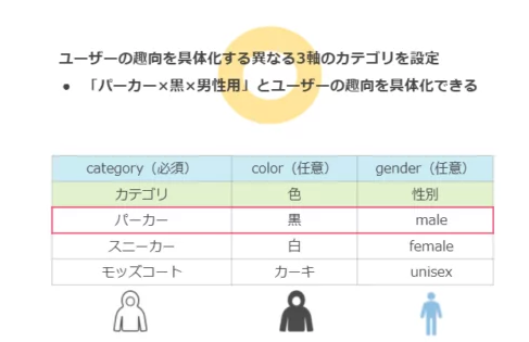 そこで、任意項目であるcolor、genderなどを追加することで、「パーカー×黒色×男性用」とユーザーの趣向を具体化した学習データを与えることができ、より購入の見込めるユーザーに配信されやすくなります。
