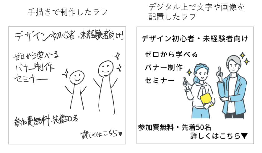 ラフは具体的なデザインやレイアウトを決定する前に、方向性をすり合わせたり整理する目的で制作します。手描きでも、デジタルでも(PowerPointなどでもOKです)作りやすいもので構いません。