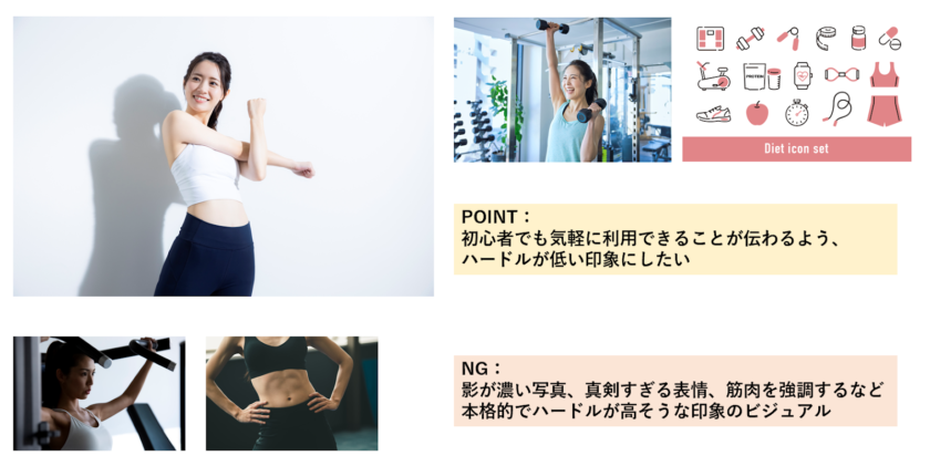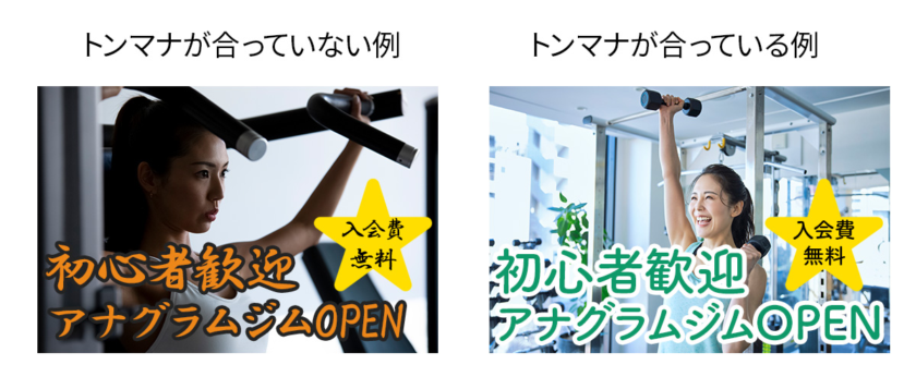たとえばフィットネスクラブの広告で「初心者歓迎」「入会費無料」など、ハードルの低さをアピールしたいとします。下図の左の例は、メッセージとビジュアル・言葉選びに一貫性がなく、違和感がありますよね。対して右側は、初心者でも親しみが持てるよう、フォントや写真素材の選び方に一貫性があります。これがトンマナが合っているということです。