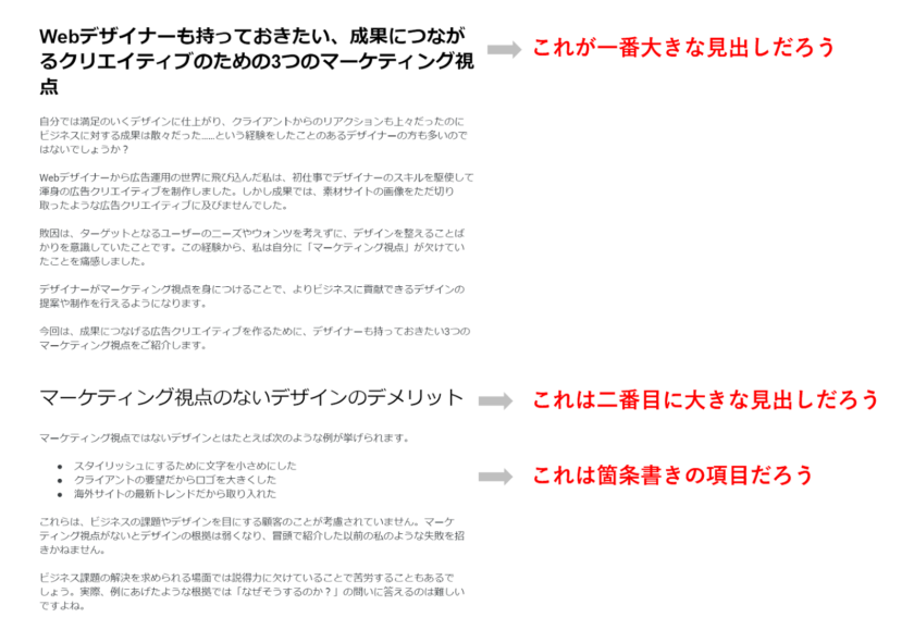 しかし検索エンジンのクローラーなどコンピューターからすると、基本的にはどれも等しく文字列なので、人間と同じように汲み取ってくれるとは限りません。