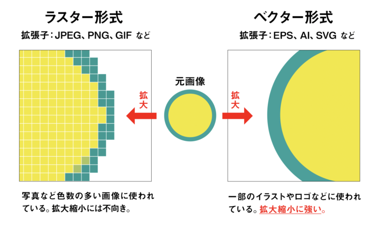 ベクター形式のデータがあれば、拡大加工して使用することができます。現場でよくあるシーンだと、提供してもらったロゴデータが要件より小さかった場合に「ベクター形式のデータはありませんか?」のようなやり取りになります。