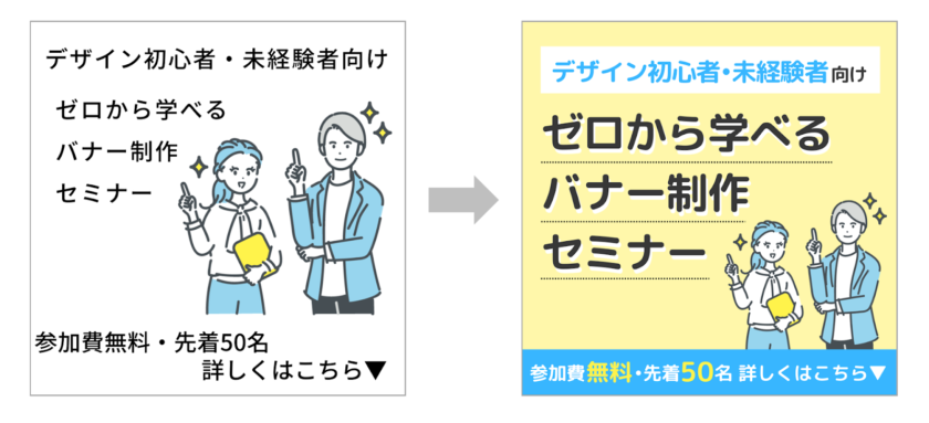 相対的な重要度を示すために、ジャンプ率のバランスを適切に取ることが重要です。たとえば以下の例では、左はジャンプ率が低く「デザイン初心者・未経験者向け」と「ゼロから学べるマナー制作セミナー」のどちらがメインのコピーか視覚的に曖昧です。
