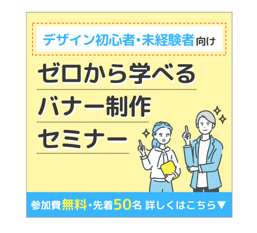 右のように、ジャンプ率や色などを調整することで、「デザイン初心者・未経験者向け」がサブコピー、「ゼロから学べるマナー制作セミナー」がメインコピーであることが視覚的に伝わるデザインになりました。