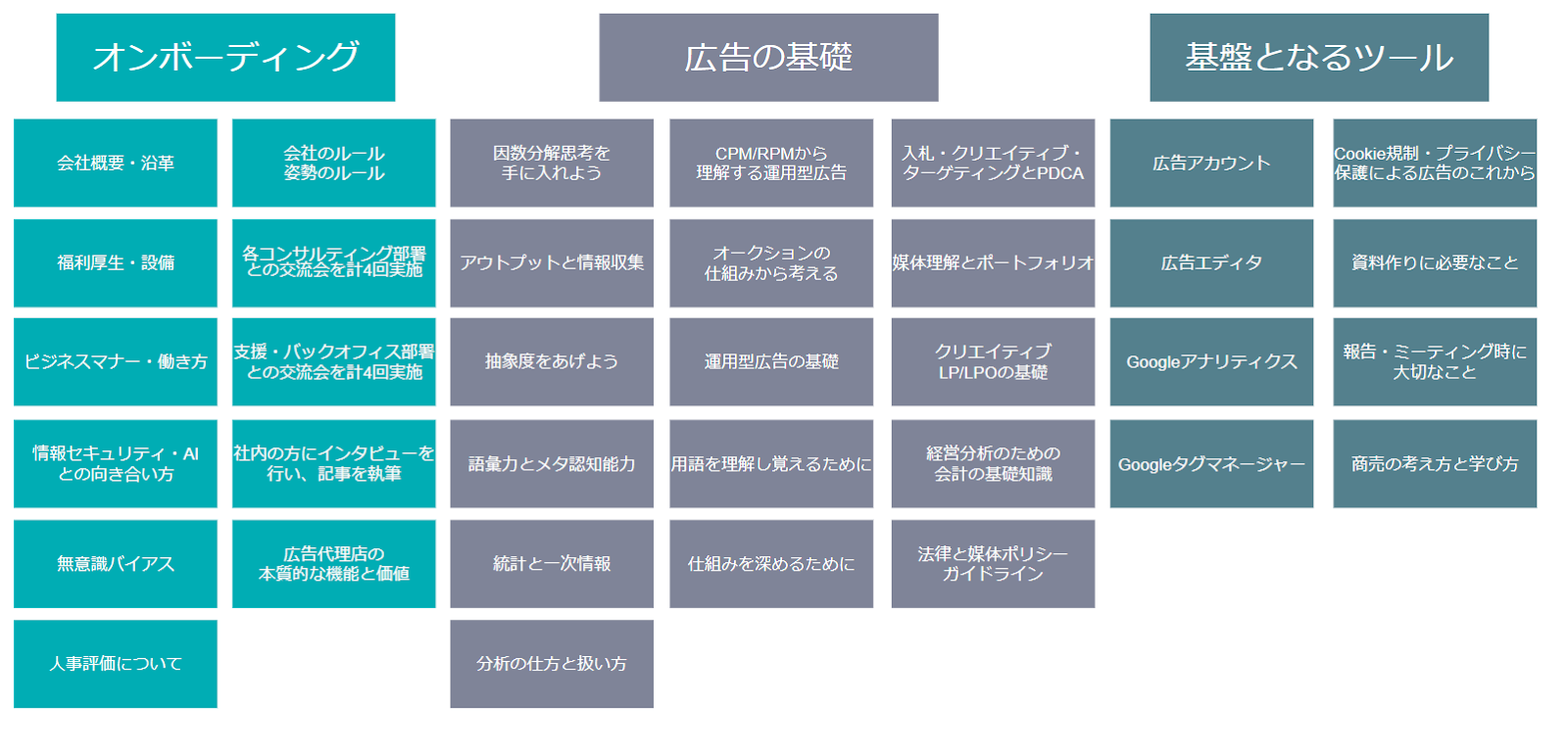 配属されるチームによって担当しているビジネスや取り扱う広告プラットフォームは異なります。それ自体は仕方のないことですが、知らないからクライアントに案内できない、質問されても答えられない、ということが起きないよう、すぐに聞ける仕組みだけでなく、分類された研修資料にアクセスできるようにしています。