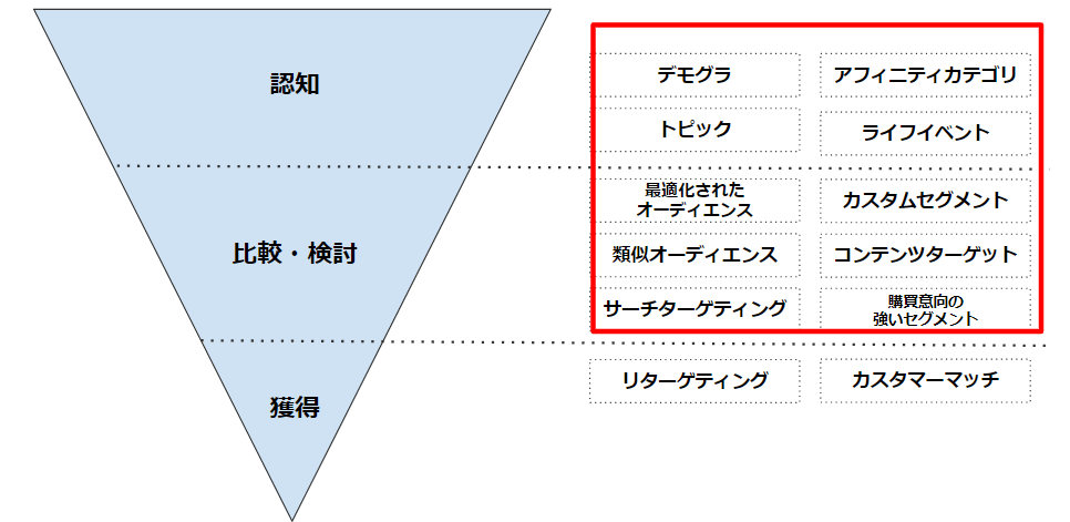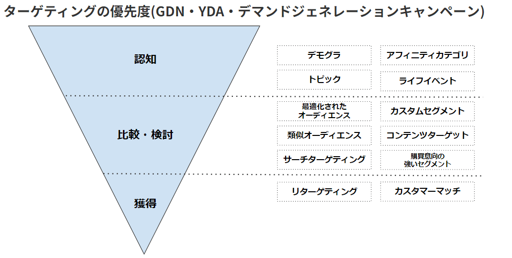 具体的にはリターゲティングなどの獲得に近いターゲティング>サーチターゲティング、最適化されたオーディエンス、購買以降の高いセグメントなどの比較検討に近いフェーズのターゲティング>企業ターゲティングやトピックやアフィニティカテゴリなどの認知フェーズのターゲティングの順番になります。(商材やLPの強さ、CVポイントのハードルの低さや広告運用力によっては比較検討や認知系のターゲティングでもCPAを合わせられるので初動から始めるパターンもあります)