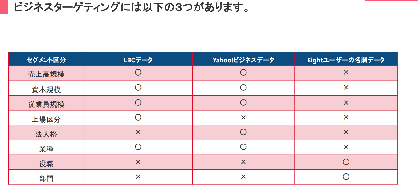 また、YDAではIPアドレスを使い指定の業種や従業員規模の企業をターゲティングできるLBCデータ、Yahoo!の法人向けサービスを利用している企業・法人の担当者群に対してターゲティングできるYahoo!ビジネスデータと更に名刺アプリ「Eight」のユーザーデータを掛け合わせたビジネスターゲティングの機能があります。