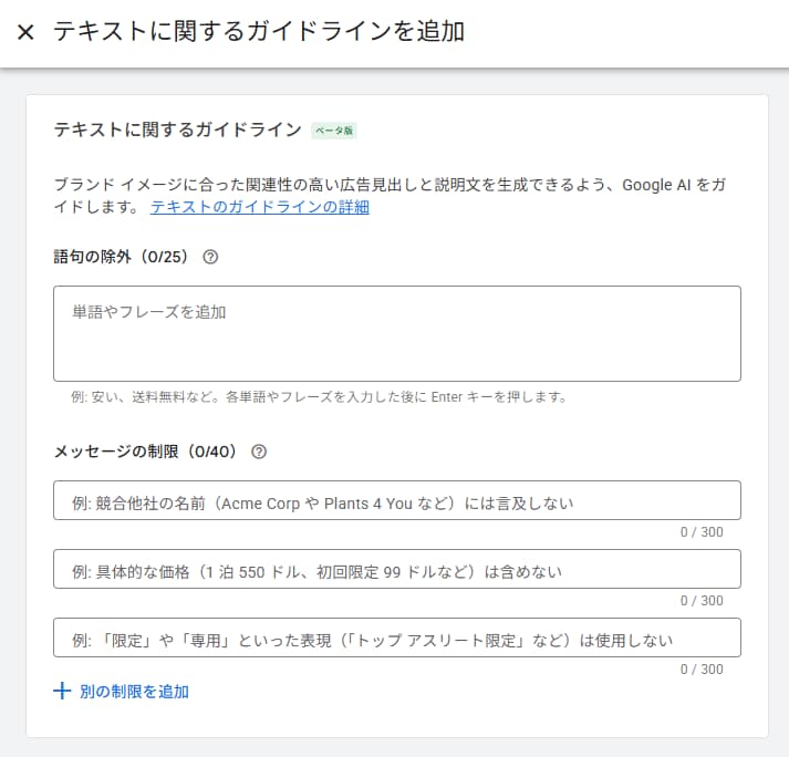 - テキストガイドライン:語句除外(最大25個)とメッセージング制限(最大40個)