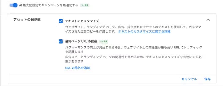 AI Maxでは、マッチングだけでなく広告の出力面にもAIが介入します。具体的には「テキストカスタマイズ」と「最終URL拡張」の2つの機能が加わります。
