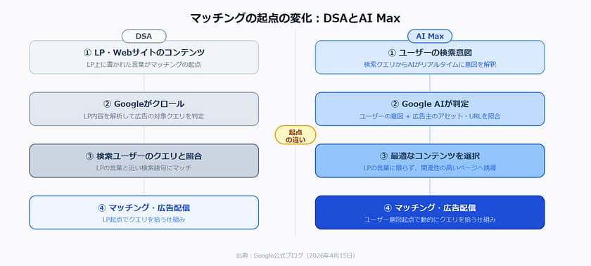 DSAでは、Googleがランディングページをクロールし、ページ上のテキストをもとにマッチングを行っていました。つまり、LPに書かれた言葉がマッチングの起点でした。広告運用者はLPのコンテンツを整備することで、ある程度マッチングの方向性をコントロールできたわけです。