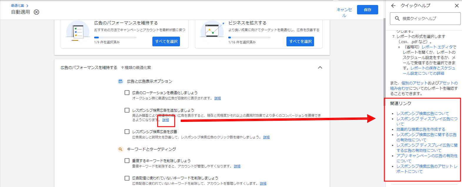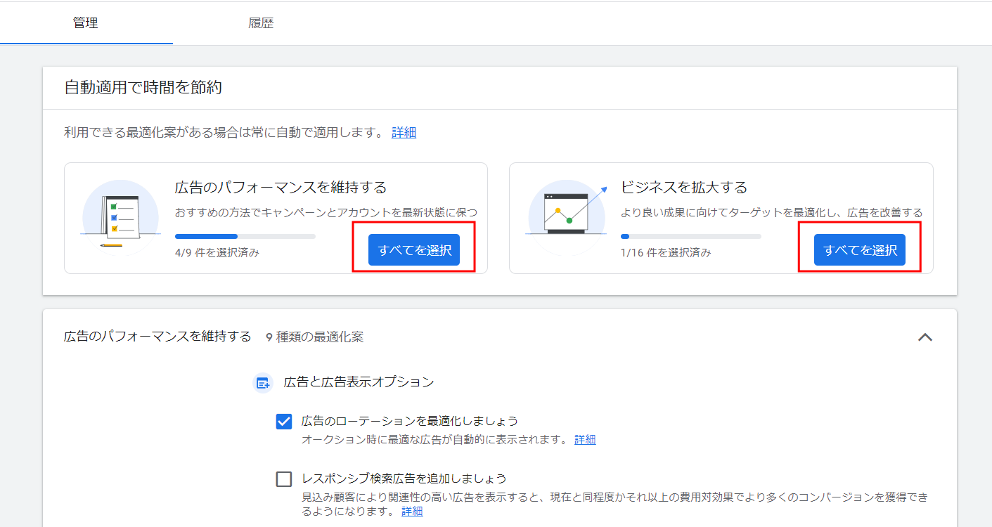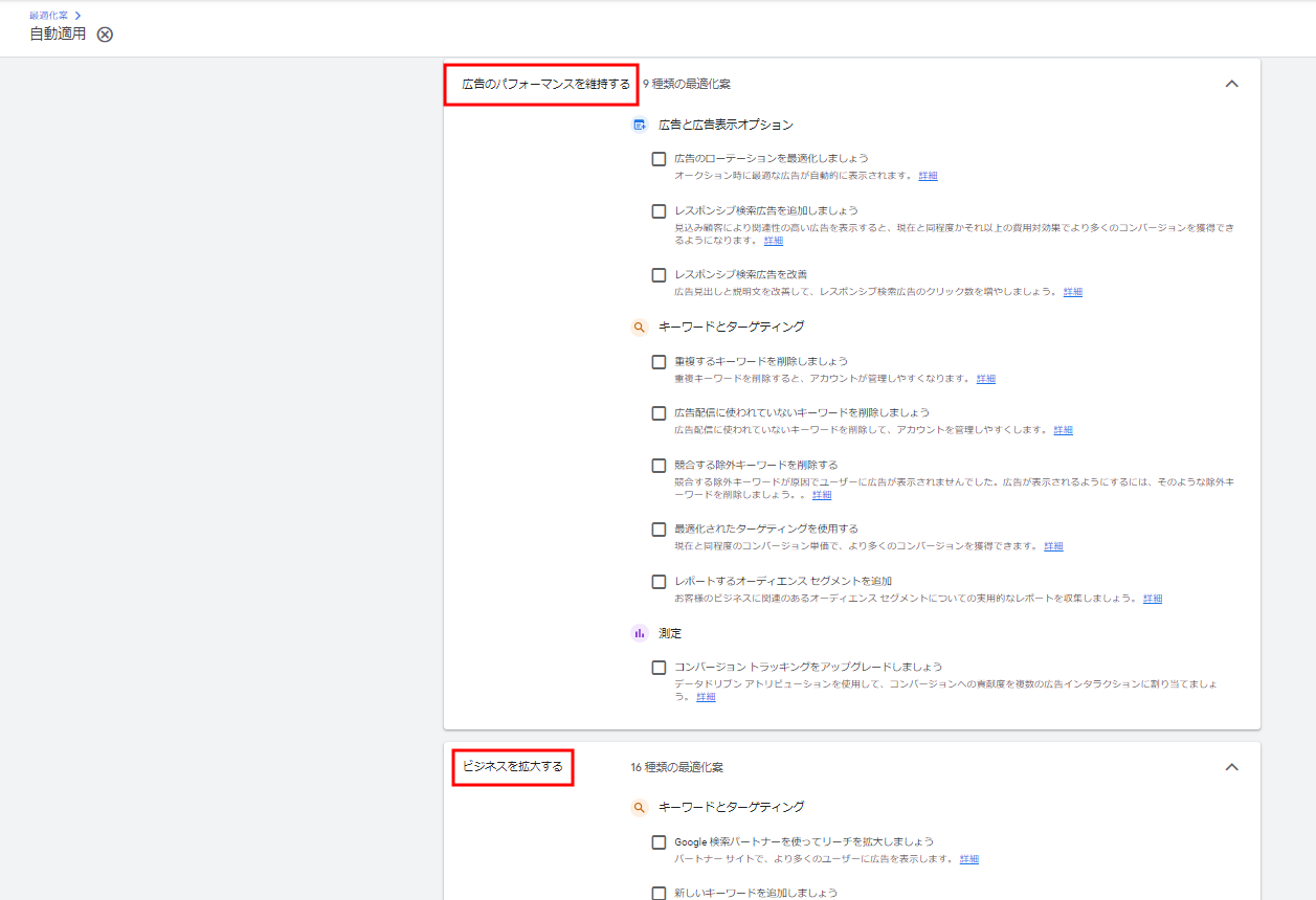 自動的に適用できる最適化案が、「広告のパフォーマンスを維持する」ものか、「ビジネスを拡大する」ものか、広告配信の目的別に分かれて表示されるようになりました。