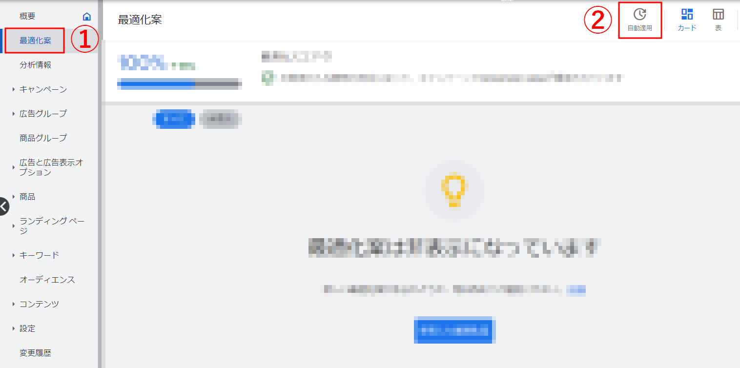※最適化案とは、キャンペーン全体の掲載結果の改善を助けてくれる、Googleによる提案機能です。詳しくは以下の記事をご参考ください。
