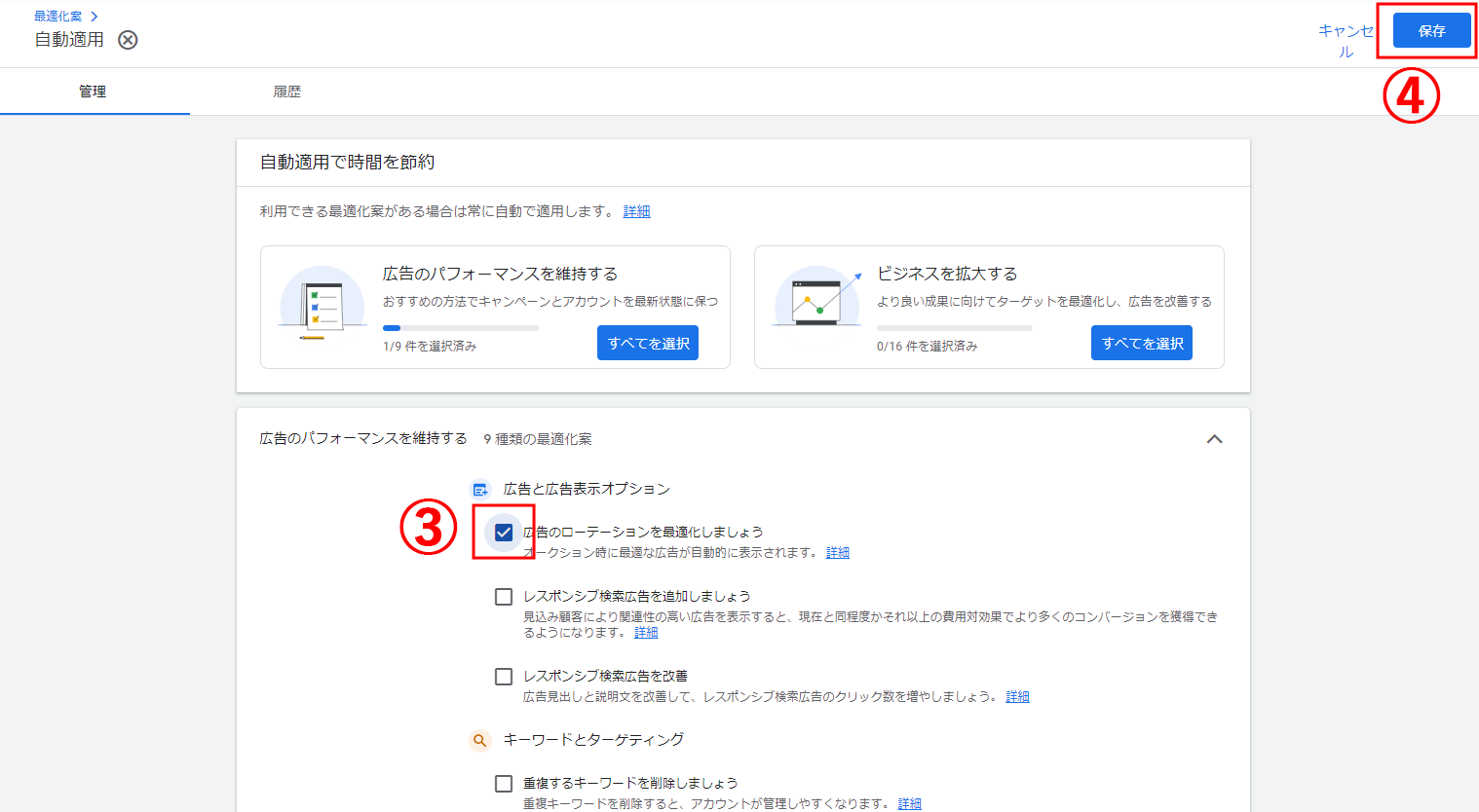 例えば、広告のパフォーマンスを維持したい場合はキーワードとターゲティングの「重複するキーワードを削除しましょう」の自動適用をオンにするなど、広告配信の目的や広告主の事業フェーズに合わせて最適化案が選びやすくなりました。