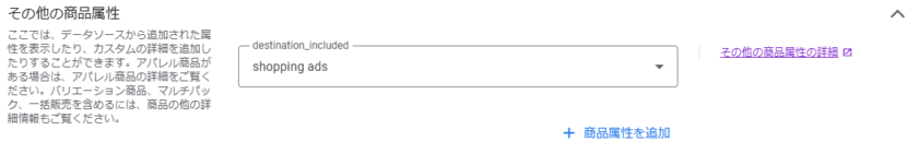 →商品Aの編集画面からその他の商品属性を選び、destination_excludedを選択後、shopping_adsを選択する。動的リマーケティングや無料リスティングには掲載されながら、ショッピング広告は掲載されない設定になる。