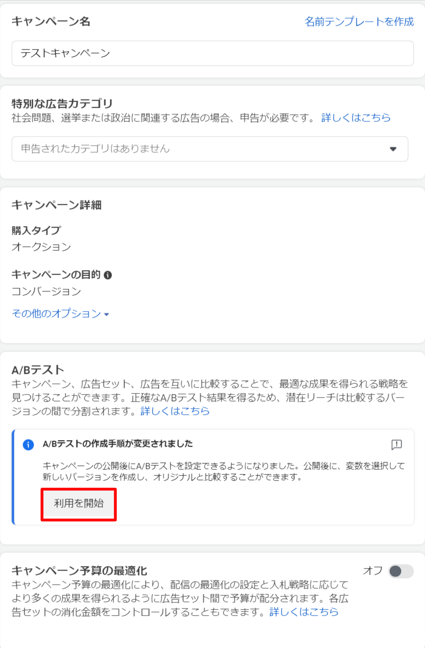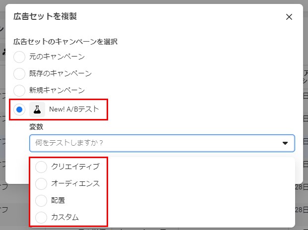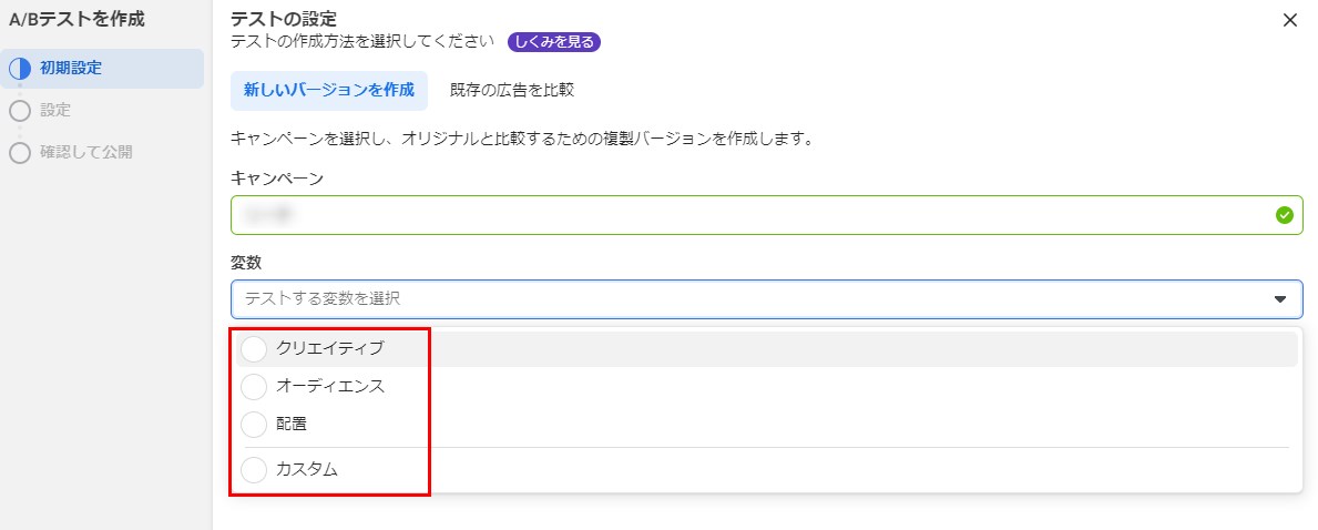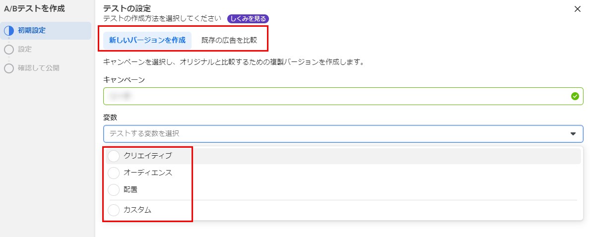 新しい広告キャンペーンの作成時にA/Bテストを作成する