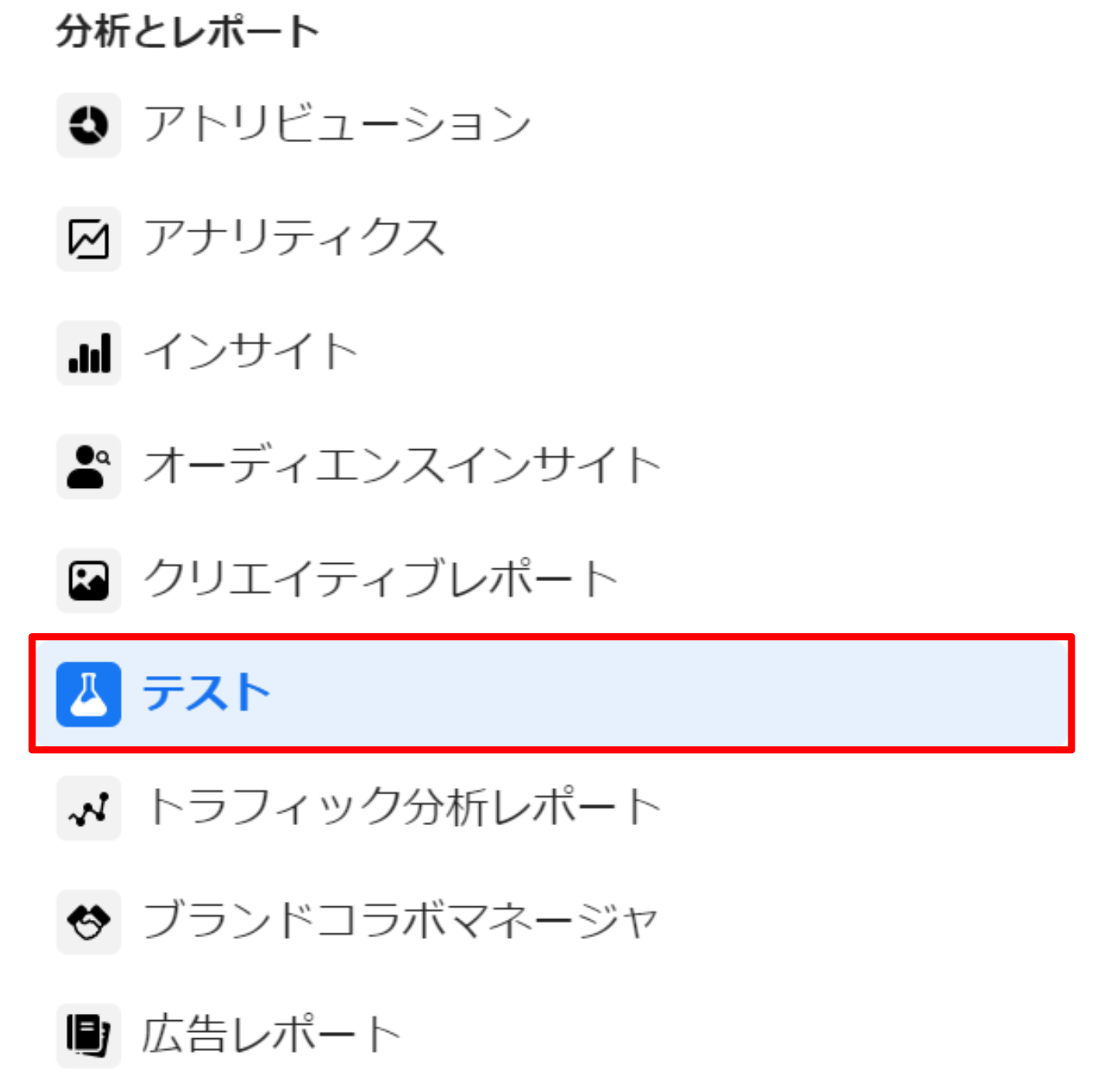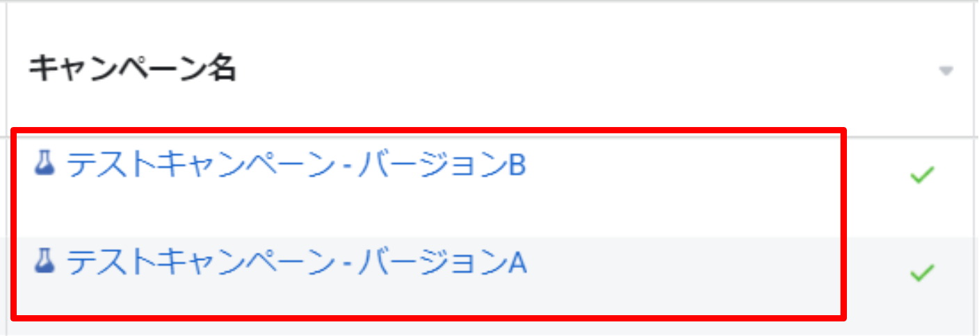 上記の画像のように、A/Bテストとして作成されたキャンペーン(広告セット、広告)名称の左側に試験管のようなマークが表示されます。