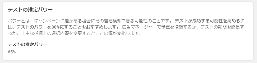 Facebookでは、テストの推定パワーが80%以上になるよう設定することを推奨しています。もし満たない場合は予算を増やしたり、掲載期間を長くするなどして信頼性の高いテストが行えるよう調整しましょう。