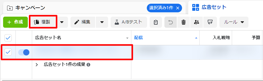 ① 広告マネージャで既存の広告セットを選択し、「複製」をクリック