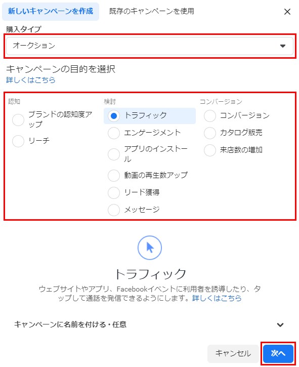 ②購入タイプとキャンペーンの目的を選択し、「次へ」をクリック