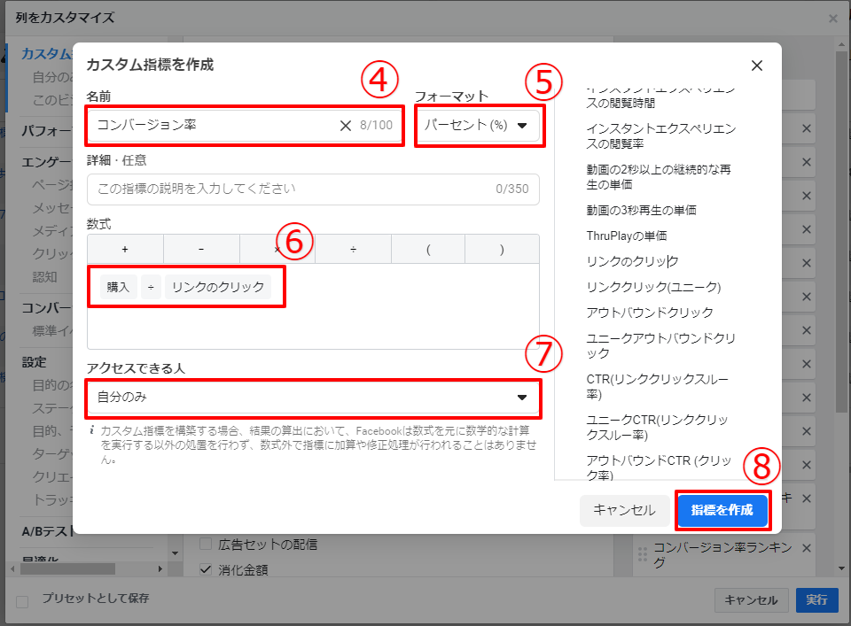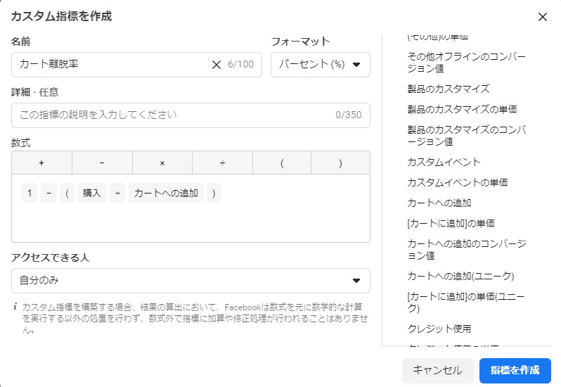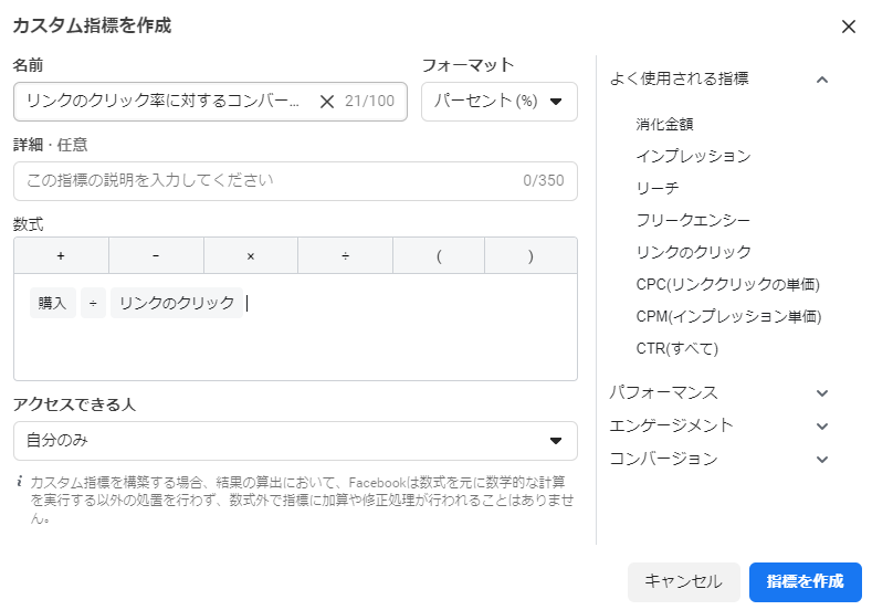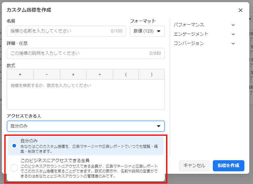 カスタム指標を作成した広告アカウントにアクセスできる全員が閲覧できます。数式の表示や、名前、説明の変更ができるのは作成した本人と、広告アカウントの管理者のみです。