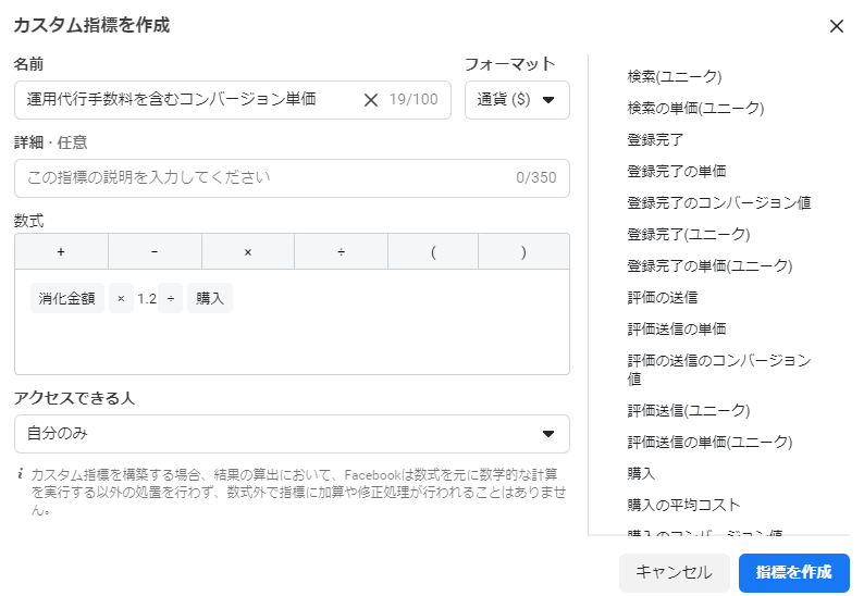 また、カスタム指標を作成した広告アカウントにアクセスできる人全員がそのカスタム指標を閲覧できます。情報漏洩につながる可能性もありますので、カスタム指標の名前にはクライアント名やサービス名は入れないようにしたいですね。