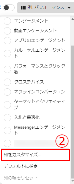 ①広告マネージャを開き、[列:パフォーマンス]のタブをクリック