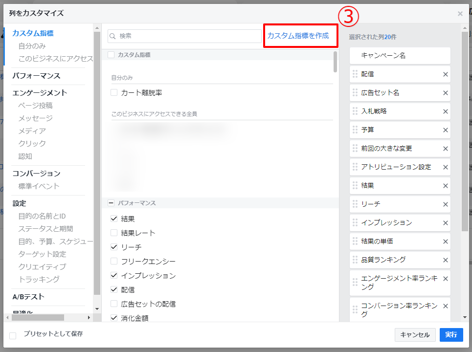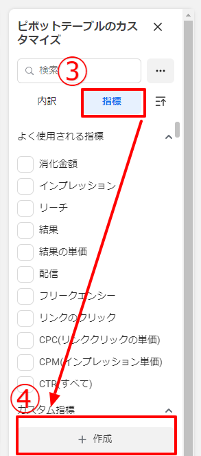 ③[カスタム指標を作成]をクリック