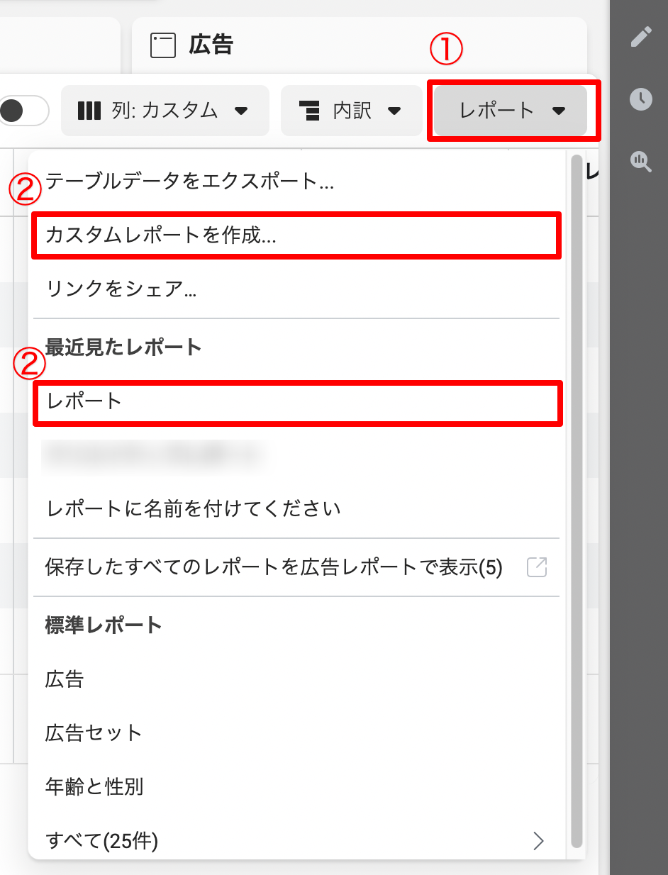 ①広告マネージャを開き、[レポート]のタブをクリック