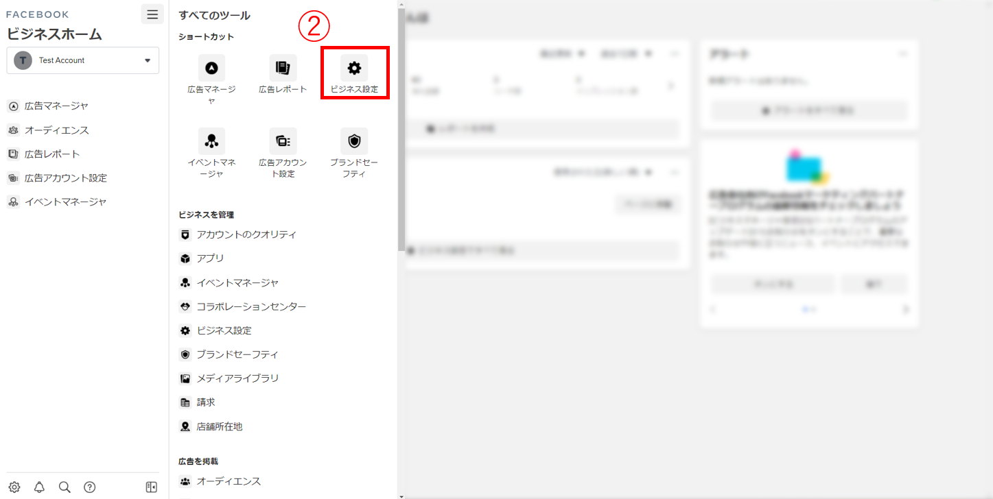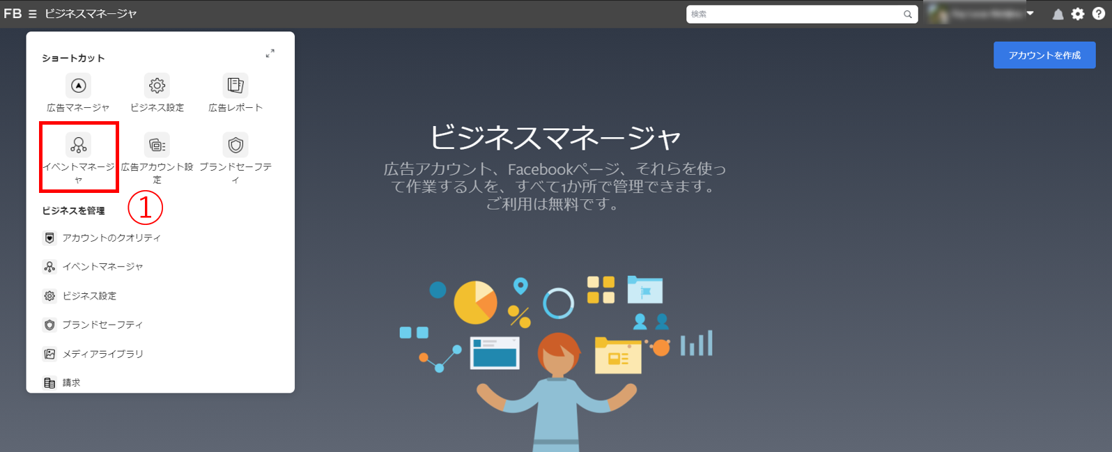 ①ビジネスマネージャーにログインし、左上のメニューボタン「≡」から[イベントマネージャ]を選択
